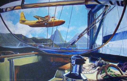 Painting features the view from a sailboat cockpit of a Grumman Mallard flying by with the St. Lucian Pitons in the background.
